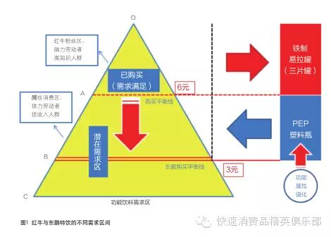 其实东鹏特饮成功的核心可以归纳为四个字——屌丝梦想。也就是说,东鹏特饮的成功,就是让有意愿但是承担不起日常喝红牛的消费者有了一款属于自己的能量饮料。(见图)