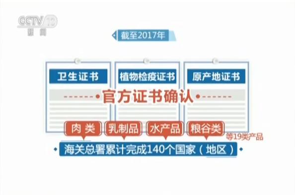 截至2017年,海关总署累计完成140个国家(地区)的肉类、乳制品、水产品、粮谷类等19类产品的卫生证书、植物检疫证书、原产地证书等官方证书确认。2017年,我国与全球主要贸易伙伴共签署了44个进出口食品安全合作协议。