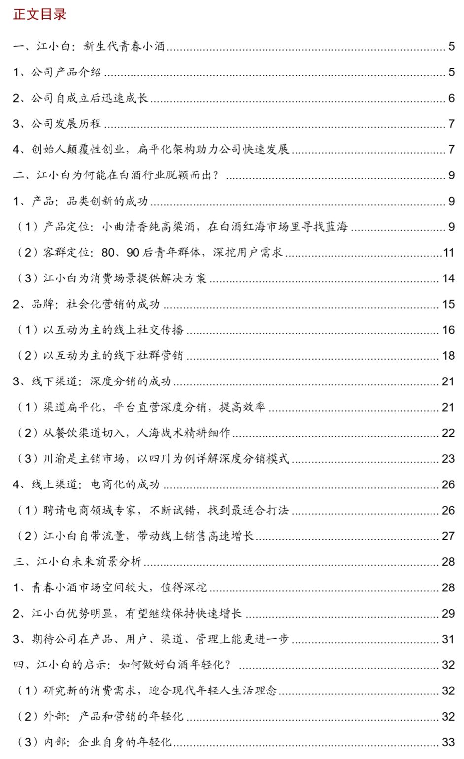 本篇报告从产品、品牌、渠道等方面详细分析了江小白这个新生代青春小酒品牌在白酒行业脱颖而出的原因,认为品类创新的成功、社会化营销的成功、线下深度分销的成功以及线上电商化的成功,是其成功的主要原因,其中精准的社会化营销及线下深度分销模式尤其值得探讨。青春小酒市场空间较大,江小白在香型、度数、包装、营销方式上均比竞品有优势,有望继续高增长。最后根据江小白的案例对其他白酒企业的年轻化给出了一些相关建议。