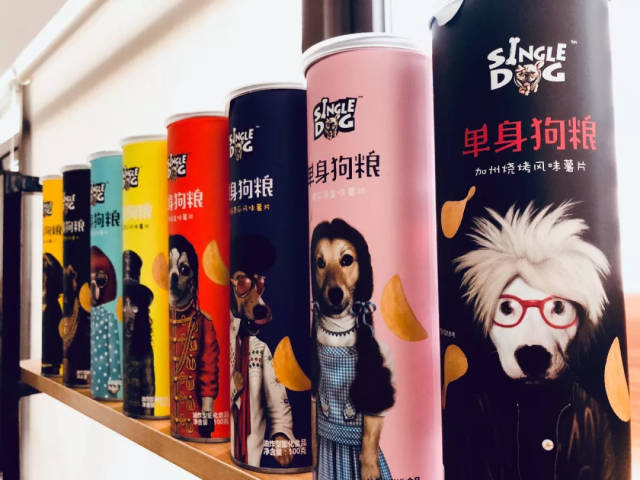在商场、超市、便利店的货架上看到“单身狗粮”薯片之前,这款产品早已曝光于每个消费者身边的朋友圈了。一包薯片印着 Pets Rock不同人物的犬类形象去展示“单身狗的多样性”,本身已经话题十足,加上口感、味道与鲜切天然等卖点,使得在薯片界还很年轻的单身狗粮顺利完成弯道超车。