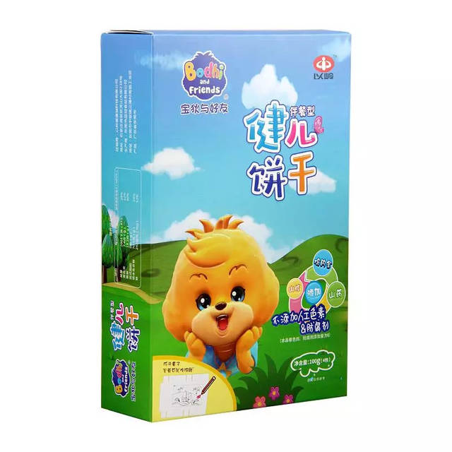 这款饼干瞄准儿童健康食品蓝海市场,借势动漫IP,卡通形象吸引儿童注意,充满童趣,包括橙奶味、蔓越莓味、巧克力味多种口味。