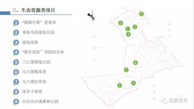 查干湖方面,“熠熠生辉”景观带项目,投资0.55亿元。建设地点位于查干湖大路及青山大街沿线。苇海鸟语湿地公园项目,投资1.4亿元。建设地点位于查干湖高速出入口西北湿地。湿地花海项目,投资1.5亿元。建设地点位于查干湖渔场契丹岛百花园。 “果市花街”田园综合体项目,投资2.16亿元。建设地点位于查干湖妙音寺村。