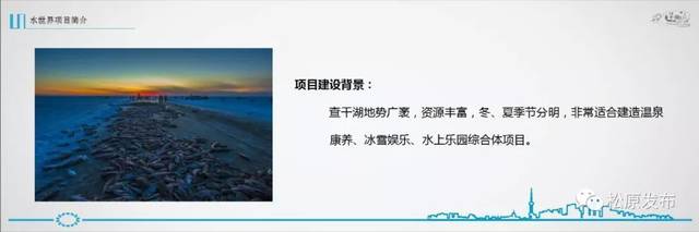 (一)项目建设背景:查干湖,蒙古语“查干淖尔”,意为白色圣洁的湖。地处松嫩平原,松花江和嫩江交汇处,是北方最大的草原淡水湖泊。地下温泉资源丰富,我们已成功打出了3眼温泉井,单井进尺深度1950米,日出水量300立方米,井口温度80度左右。