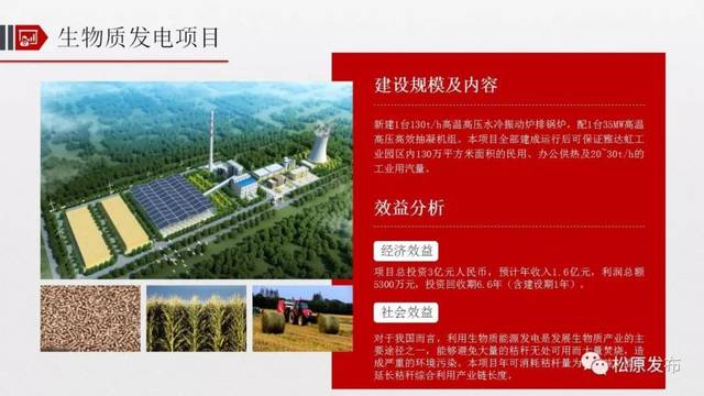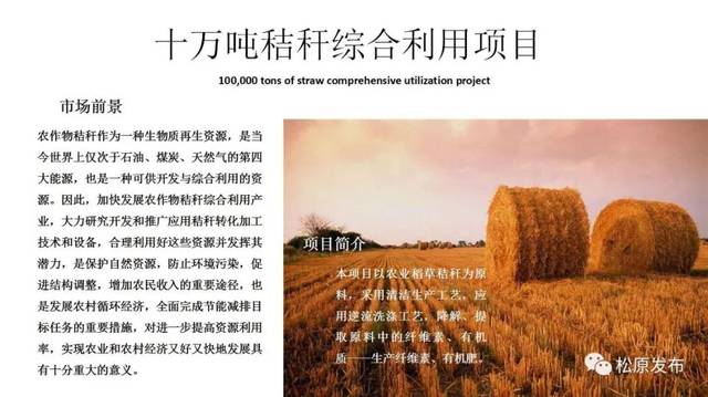 三、10万吨秸秆综合利用项目,总投资1.15亿元,占地面积13万平方米。年加工生物质秸秆10万吨,年产出纤维素5万吨,有机肥3.8万吨。主要建设纤维素提取生产线一条,有机肥生产线一条,配套建设仓库及污水处理站等。项目建成投产后,预计利润5500万元、所得税1200万元、税后利润4300万元、投资财务内部收益47%、投资回收期3.31年(税前)。