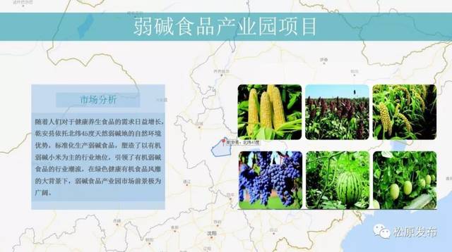 1、弱碱食品产业园项目。利用乾安碱土地特点及丰富的农产品、蔬果资源,建设弱碱食品产业园,做优农副产品加工业,提高农副产品附加值,将产品变成产业。在品牌打造上,主打弱碱品牌。在发展方向上,向健康、绿色、休闲食品方向发展,项目市场前景广阔。