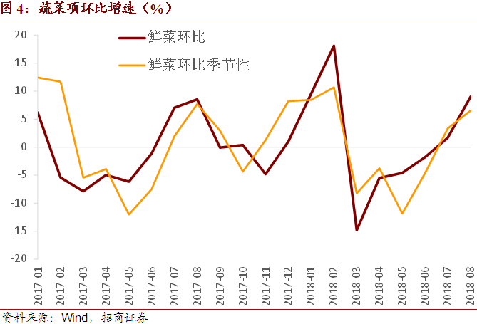 高温多雨天气导致8月菜价环比上涨9%,超出季节性部分额外拉动CPI环比抬升0.06个百分点,年内菜价的扰动仍属短期因素。