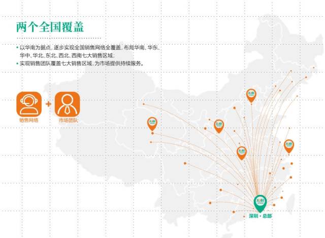 以华南为据点,逐步实现全国销售网络大覆盖,布局华东、华南、华中、华北、东北、西北、西南七大销售区域,为市场提供持续服务。
