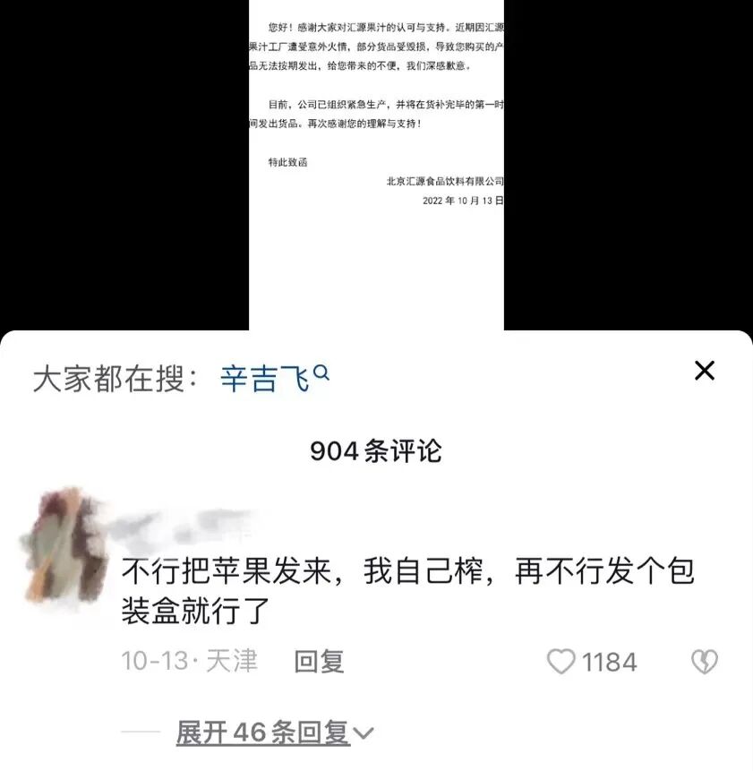 汇源果汁官方回食品经营许可证办理需要多久复:理性消费。图/汇源账号直播截图